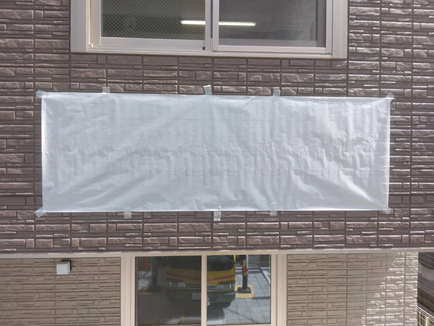 看板を設置する位置に原寸原稿をあてて位置を出しました。この原稿を利用して看板を固定するアンカー位置を決めます。