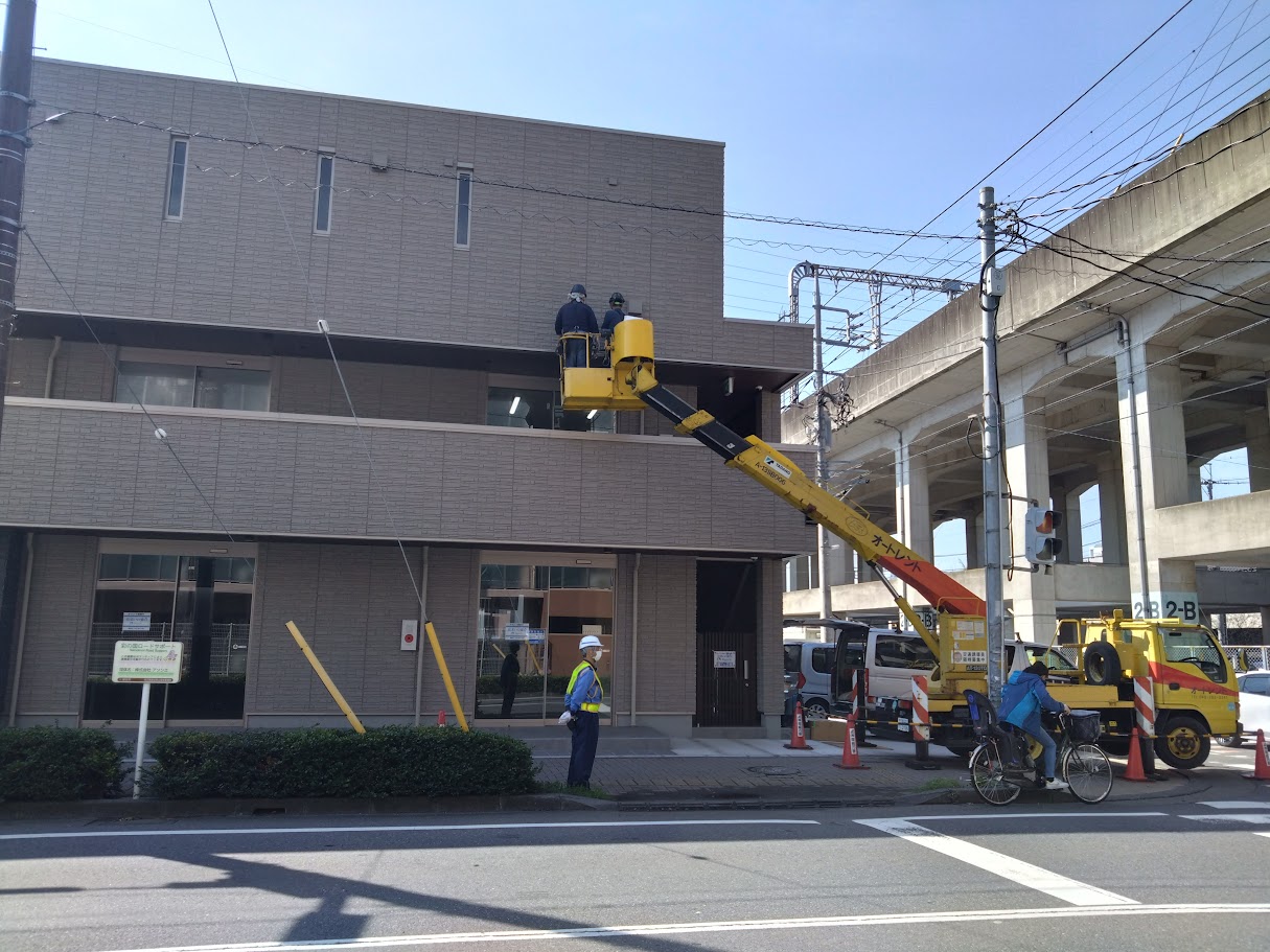 看板は高い壁面に設置するので高所作業車を使用します。